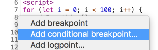 1. 조건부 중단점을 추가할 라인넘버를 우클릭한 후 "Add conditional breakpoint"를 선택한다.